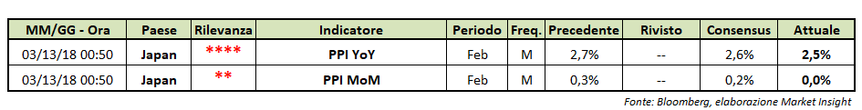 I prezzi alla produzione di febbraio in Giappone mostrano su base mensile una variazione nulla, sotto il consensus (+0,2%) e inferiore rispetto al +0,3% di gennaio.