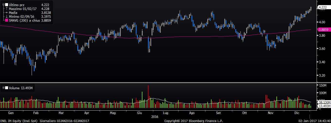 Un inizio 2017 spumeggiante per le azioni della società guidata da Francesco Starace, che intorno alle ore 12:10 della seduta odierna hanno toccato quota 4,228 euro, nuovo massimo intraday da luglio 2015. Alle ore 15:15 le quotazioni si sono riportate in area 4,225 euro con un rialzo dello 0,8%, mentre il Ftse Mib segna +1,7% rispetto alla chiusura di venerdì 30 dicembre. Si segnala comunque che i volumi sono ancora bassi: al momento sono state scambiate 14,1 milioni di azioni Enel contro una media giornaliera registrata nelle ultime 10 sedute pari a circa 33,8 milioni.