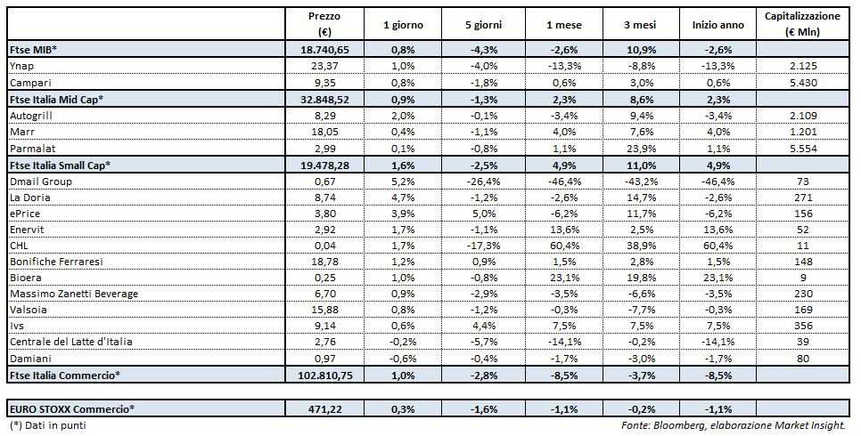 Seduta positiva per la Borsa Italiana con il Ftse Mib che ha evidenziato un +0,8% a 18.740,65 punti, in attesa della conclusione della riunione della Fed. Giornata in rialzo anche per il settore Commercio il cui indice Ftse Italia Commercio ha segnato un +1% sovraperformando il corrispondente indice europeo Euro Stoxx Commercio dello 0,7 per cento. Tra i titoli del settore presenti nel Ftse Mib si è distinta Ynap chiudendo con un +1%.