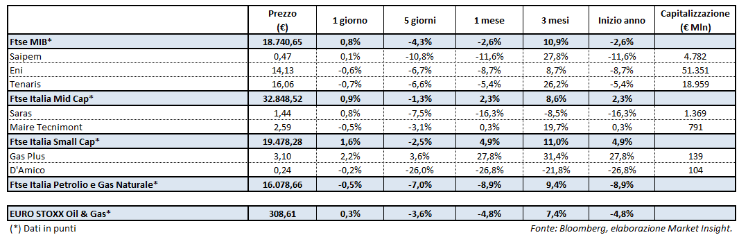 Tutte in positivo le borse europee ad esclusione del PSI 20 in lieve flessione. Piazza Affari segna un rialzo beneficiando soprattutto della performance dei bancari. Il Ftse Mib chiude a 18.740,65 punti (+0,8%). Il Ftse Italia Petrolio e Gas Naturale archivia la seduta a 16.078,66 punti (-0,5%) e l’Euro Stoxx oil&gas è a 308,61 punti (+0,3%).