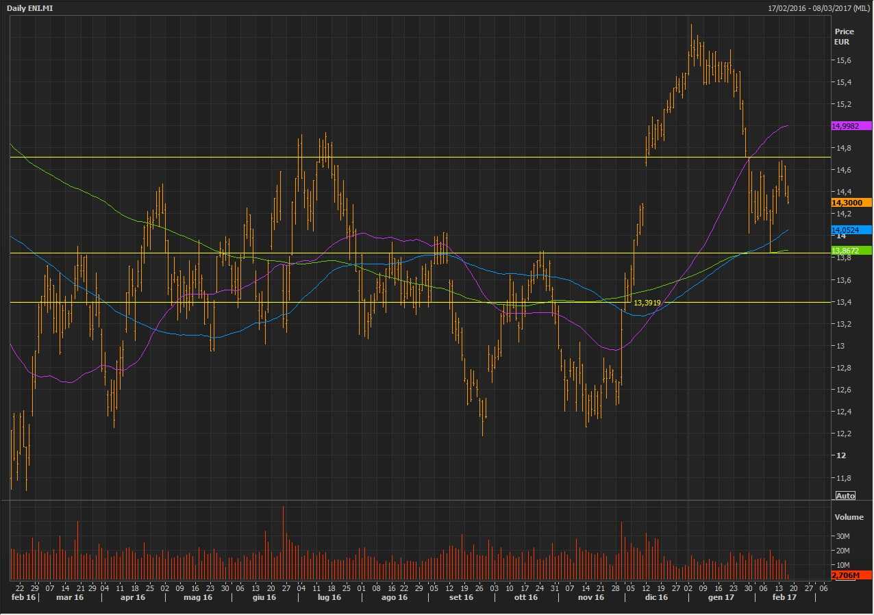 Da fine gennaio, il colosso petrolifero italiano sta oscillando, con importanti variazioni intraday, tra la resistenza statica posizionata a 14,71 euro e il supporto statico posto a 13,84 euro (livello da cui nelle scorse sedute è transitata anche la media mobile a 200 sedute). Un andamento non molto difforme da quello registrato nello stesso periodo dalle quotazioni del greggio sui mercati internazionali.