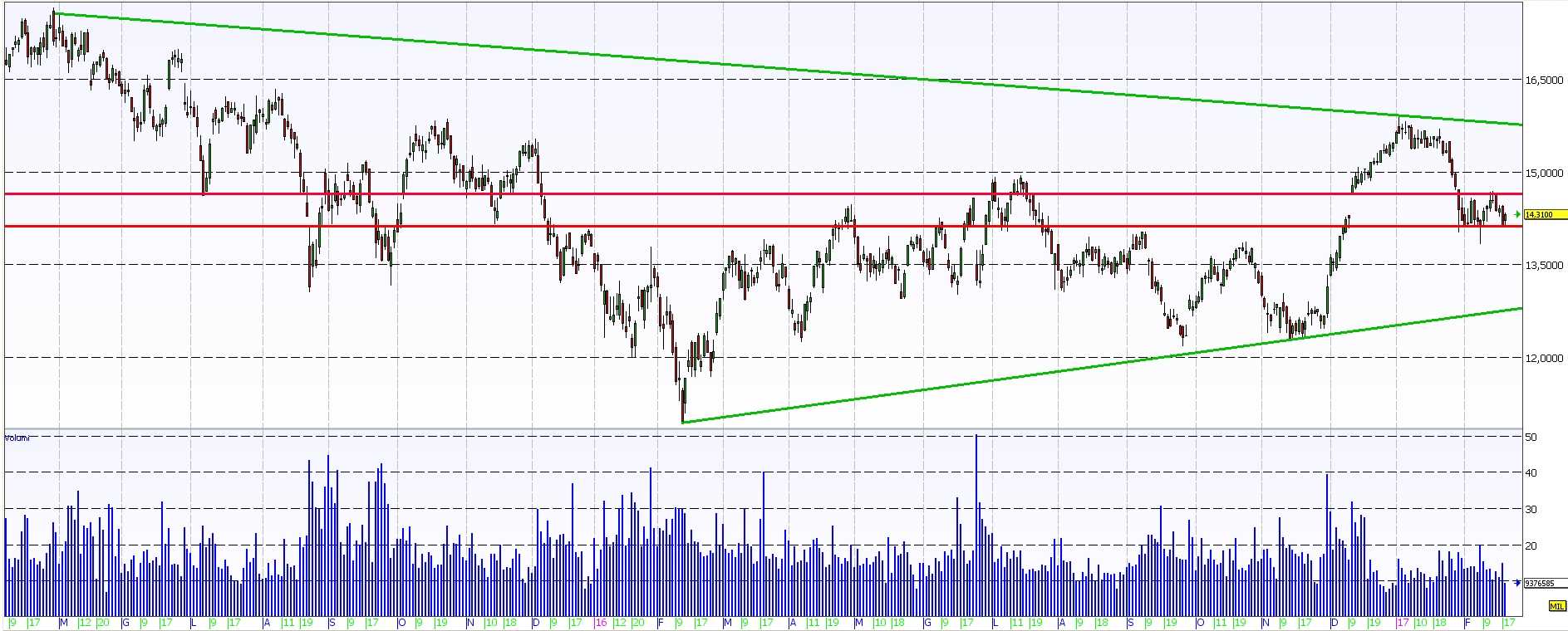 Con l’attuale configurazione, l’azione ha una resistenza di breve a 14,65 euro, ma sembra tuttavia poco probabile che abbia la forza di andare a violarla al rialzo nelle prossime sedute. Più probabile che si affronti un altro periodo di lateralità come quello che ha contraddistinto le sedute da fine gennaio a questa parte.