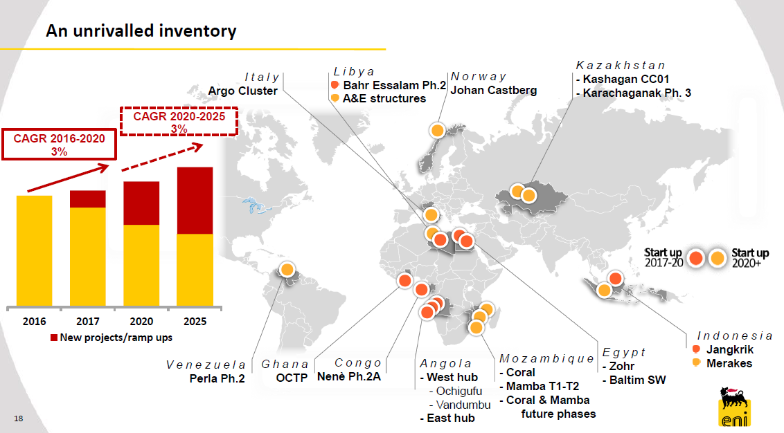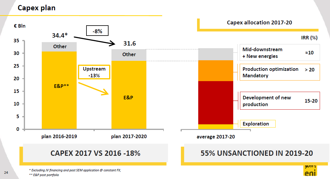 L’Ad Descalzi ha presentato alla comunità finanziaria il Piano Strategico della società per il periodo 2017-2020. Il nuovo piano intende sviluppare una generazione di cassa superiore rispetto al recente passato, tramite la costruzione di un portafoglio dall’alto margine grazie a risorse materiali e convenzionali, operazioni design-to-cost e asset di alto valore.