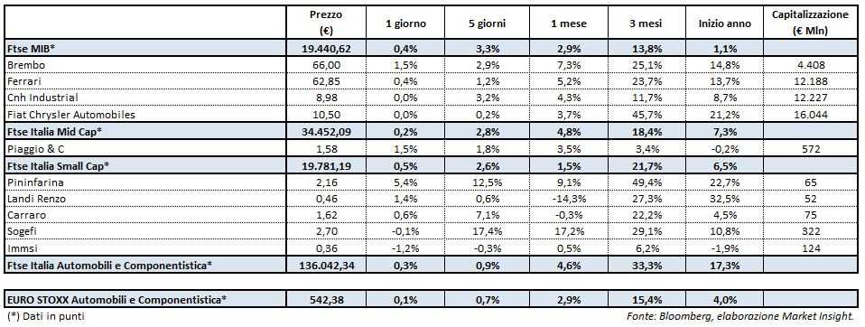Leggero progresso anche per il Ftse Italia Automobili e Componentistica (+0,3%), sostanzialmente allineato al corrispettivo indice europeo (+0,1%).
