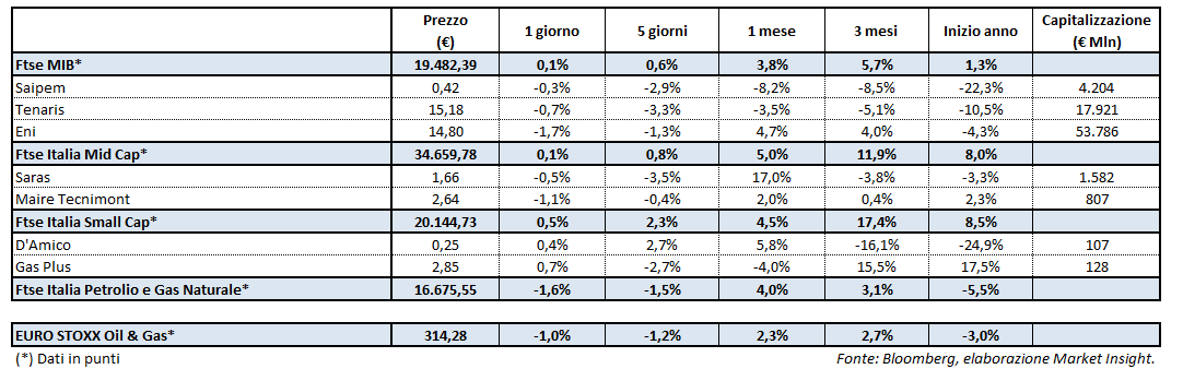 Le quotazioni del petrolio sono in forte calo con il Brent a 54,03 dollari (-3,38%) e il Wti a 51,17 dollari (-3,71%). Per quanto riguarda i titoli del comparto le big cap chiudono al ribasso con Eni in testa che cede 1,7% a 14,80 euro. Giù anche Tenaris che flette dello 0,7% a 15,18 euro, mentre Saipem limita le perdite al -0,3 per cento. In calo anche le mid cap con Maire che flette del 1,1% e Saras dello 0,5 per cento. Fanno meglio le small cap con d’Amico in crescita dello 0,4% e Gas Plus dello 0,7 per cento.