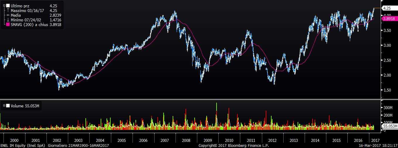 Gli acquisti sul titolo Enel si sono scatenati in attesa dei risultati relativi all’esercizio 2016, che verranno rilasciati domani mattina prima dell’apertura dei mercati. Ricordiamo che Enel aveva già diffuso alcuni dati preliminari (ricavi, Ebitda e debito) lo scorso 9 febbraio [Enel – 4Q 2016 preliminare, Ebitda sopra le attese a 3,29 mld].