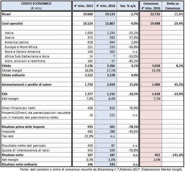 L’aumento di ammortamenti e perdite di valore del 15,6% ha fatto sì che l’Ebit del 4° trimestre 2016 diminuisse del 10,5% su base annua a 1,23 miliardi, con una marginalità scesa dal 7% al 6,4 per cento. Al di sotto della gestione operativa, il balzo degli oneri finanziari netti del periodo (+76,9% a/a) e degli oneri da partecipazioni ha determinato un risultato netto di competenza del gruppo negativo per 187 milioni, contro i 107 milioni del 4° trimestre 2015.
