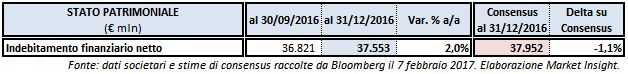 L’indebitamento finanziario netto al 31 dicembre 2016 è aumentato a 37,55 miliardi rispetto al dato di fine settembre e al target di 37,2 miliardi indicato nel Piano, ma rimane il linea con il debito registrato al 31 dicembre 2015 e al dato preliminare rilasciato il 9 febbraio.