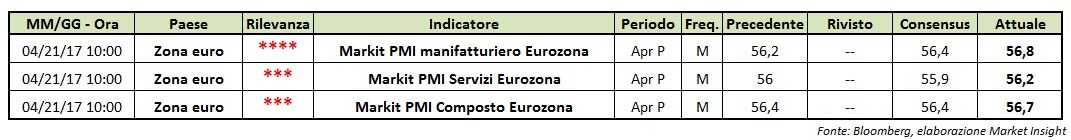 - Il pmi composto ad aprile evidenzia una crescita a 56,7 punti, in aumento dai 56,4 punti del mese precedente. Gli analisti si aspettavano un dato pari a 56,4 punti.