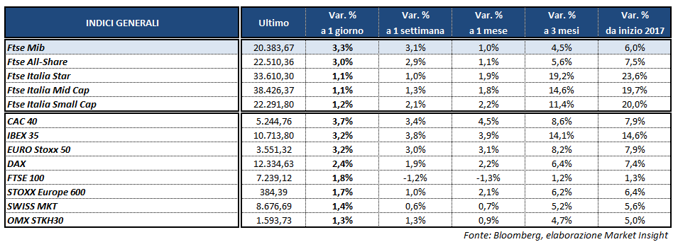 Piazza Affari è la migliore tra le borse europee, subito dietro il Cac 40, la Borsa parigina (+3,7%). Bene anche l’Ibex 35 che sale del 3,2 per cento e il Dax del 2,4 per cento.