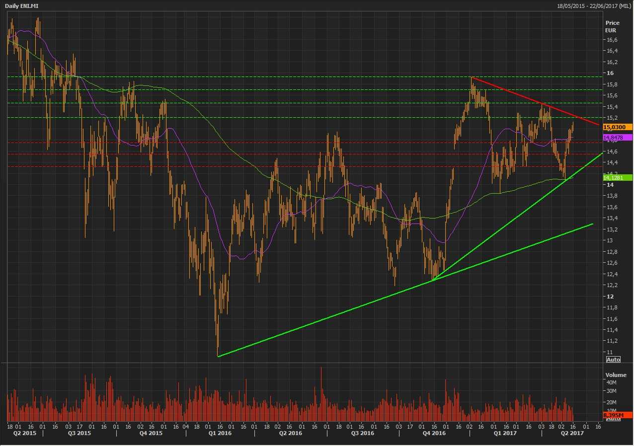 Il forte recupero registrato dai prezzi del greggio nelle ultime sedute ha consentito alle quotazioni del colosso petrolifero italiano di riportarsi al di sopra della soglia, non soltanto psicologica, dei 15 euro.