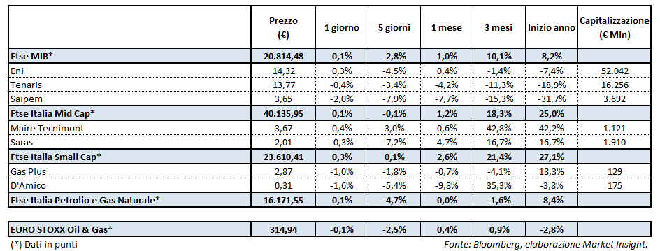 Borse europee in ordine sparso, Piazza Affari rimane stabile dopo lo scivolone di lunedì sulla possibilità di elezioni politiche anticipate in Italia. Il Ftse Mib chiude a 20.814,48 punti (+0,1%). Il Ftse Italia Petrolio e Gas Naturale archivia la seduta a 16.171,55 punti (+0,1%) e l’Euro Stoxx oil&gas è a 314,94 punti (-0,1%).