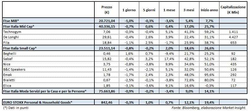 Chiude in calo anche il Ftse Italia Moda Servizi per la Casa e per la Persona, che segna un -0,9% rispetto al -0,3% del corrispettivo indice europeo.