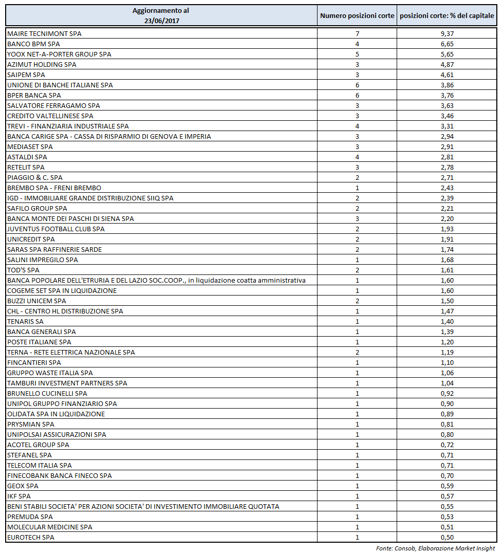 In data odierna il titolo più shortato è Maire Tecnimont con 7 posizioni nette corte per una quota pari al 9,37% del capitale (7 posizioni pari al 9,25% del capitale al 16 giugno).