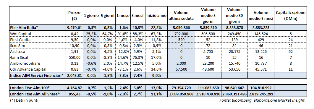 Ieri, in un contesto borsistico internazionale debole, con Milano in controtendenza, l’indice del comparto Aim Servizi Finanziari ha guadagnato lo 0,6%. Anche il Ftse Italia All Share è salito dello 0,6%, mentre il Ftse Aim Italia ha perso lo 0,3% e il London Ftse Aim 100 lo 0,7 per cento.