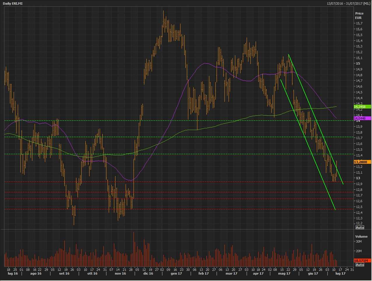 La tenuta del supporto statico posizionato a 12,94 euro, accompagnata dal deciso recupero dei prezzi del petrolio, ha consentito alle quotazioni dei titoli del cane a sei zampe di tornare nella seduta odierna a ridosso di 13,30 euro. In questo modo i corsi di Eni si sono portati al di sopra della parete superiore del canale discendente disegnato a partire dal massimo relativo intraday dello scorso 22 maggio a 15,16 euro e attualmente passante per 13,17 euro.