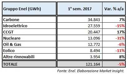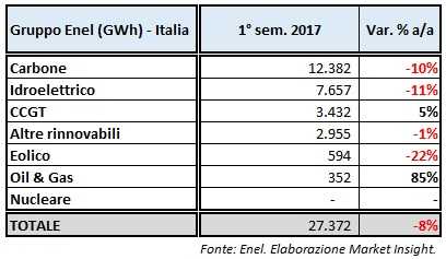 Entrando nel dettaglio, nel 1° semestre del 2017 la produzione netta di energia elettrica del gruppo Enel è stata pari a 121.164 GWh, in flessione del 5% rispetto allo stesso periodo del 2016. In particolare, il gruppo guidato da Francesco Starace ha registrato il crollo dell’output delle centrali nucleari (-31% a/a), accompagnato da una decisa flessione della generazione idroelettrica (-15% a/a) e da un calo più contenuto della produzione eolica (-11% a/a). In aumento, invece, la generazione di energia elettrica relativa agli impianti a carbone (+7% a/a), CCGT (+17% a/a) e da quelli alimentati da altre fonti rinnovabili (+8% a/a).