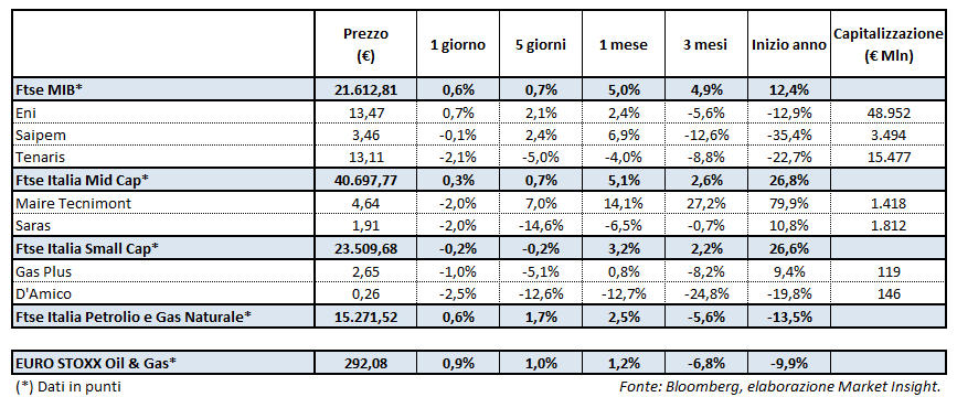 Chiudono in positivo le borse europee sostenute dalla buona performance dei titoli petroliferi e automotive. A fare da assist anche i prezzi del petrolio vicini ai massimi da due mesi. Il Ftse Mib chiude a 21.612,81 punti (+0,6%). Il Ftse Italia Petrolio e Gas Naturale archivia la seduta a 15.271,52 punti (+0,6%) e l’Euro Stoxx oil&gas è a 292,08 punti (+0,9%).