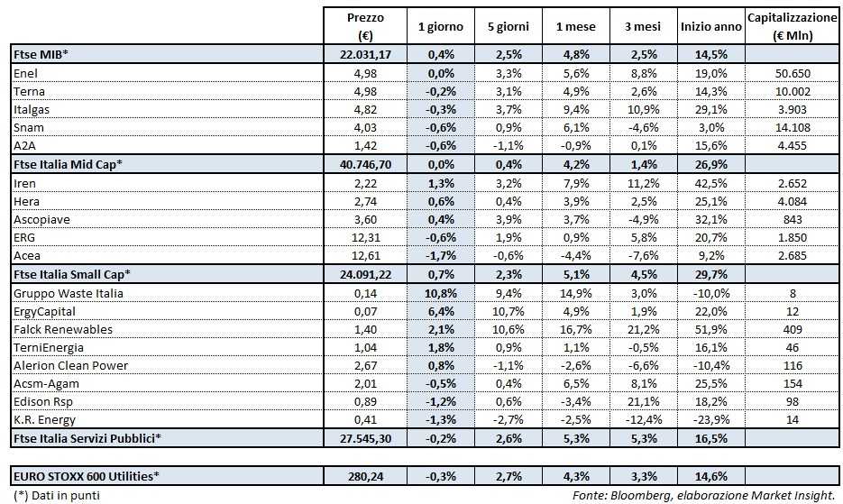 Il paniere tricolore delle società del comparto utility e delle rinnovabili quotate a piazza Affari ha comunque registrato una performance giornaliera sostanzialmente in linea con quella dello Stoxx Europe 600 Utilities (-0,3%), ignorando l’andamento di ieri dei rendimenti sui titoli di Stato europei. Lo yield sui governativi del vecchio Continente è diminuito praticamente in tutti i Paesi e su tutte le scadenze, anche se le flessioni più accentuate sono state rilevate sulla scadenza medio-lunghe dei Periferici.