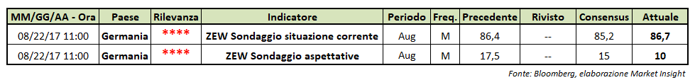 L’indice ZEW sulla fiducia degli investitori istituzionali tedeschi nel mese di agosto è sceso a 10 punti dai 17,5 di luglio. Il risultato è inferiore alle stime degli economisti, che si aspettavano una discesa a 15.