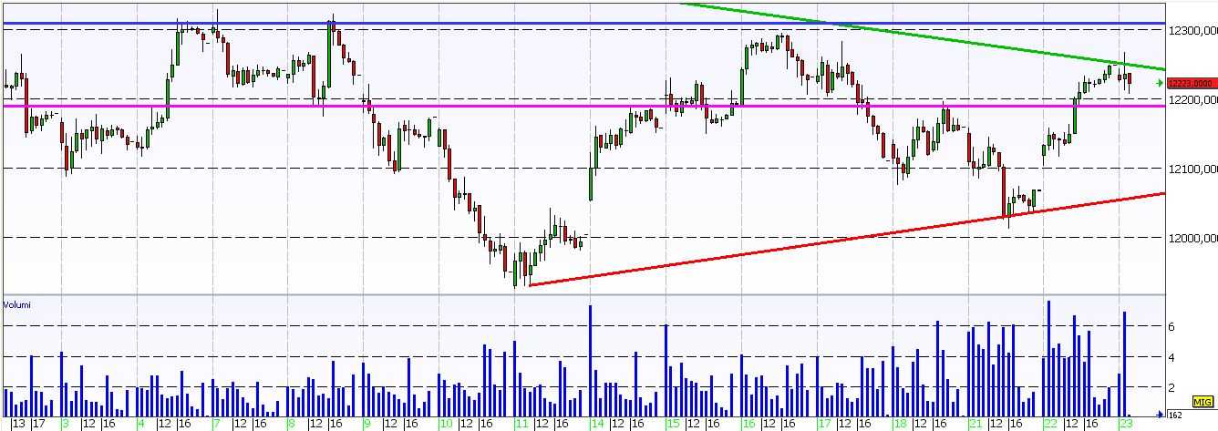 Il future tuttavia ha solo sporcato al rialzo tale barriera (arrivando a 12267 punti) producendo una falsa rottura che probabilmente ha fatto saltare moti stop degli operatori. Il mercato è così tornato sotto la resistenza e probabilmente tenterà già in mattinata di raggiungere il supporto statico di 12190 punti (linea porpora del grafico).