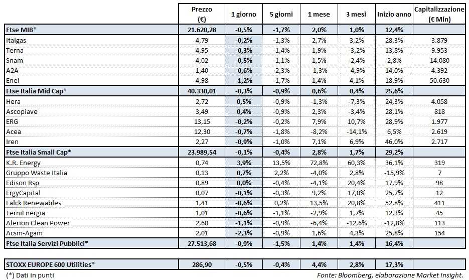 L’andamento di ieri del Ftse Italia Servizi Pubblici è così stato peggiore sia rispetto al principale indice di piazza Affari, cioè il Ftse Mib (-0,5%), sia rispetto allo Stoxx Europe 600 Utilities (-0,5%).