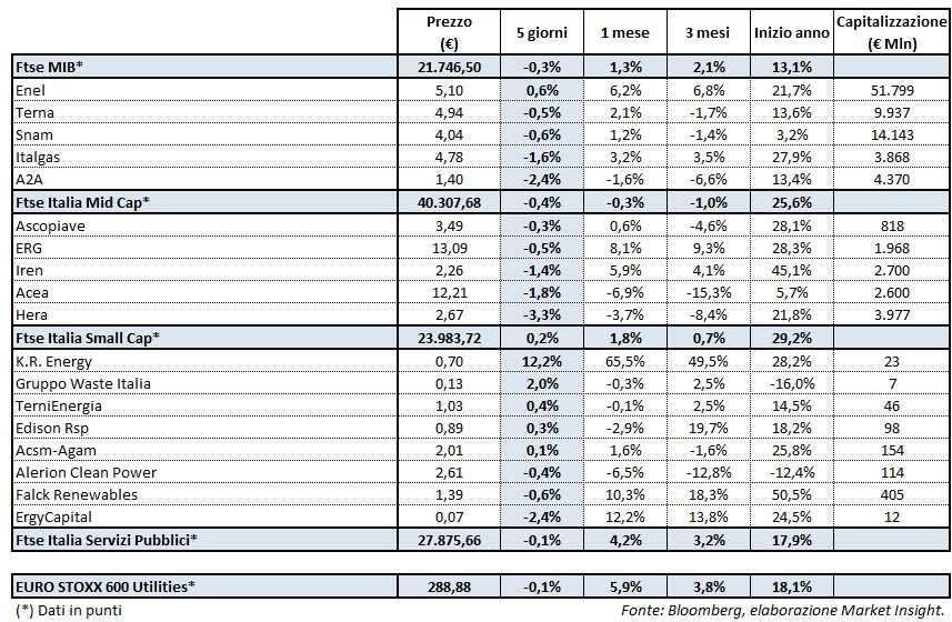 Il Ftse Italia Servizi Pubblici è comunque riuscito a registrare una performance borsistica settimanale migliore rispetto a quella dell’indice principale di piazza Affari, cioè il Ftse Mib (-0,3%), ed esattamente in linea con quella dello Stoxx Europe 600 Utilities.