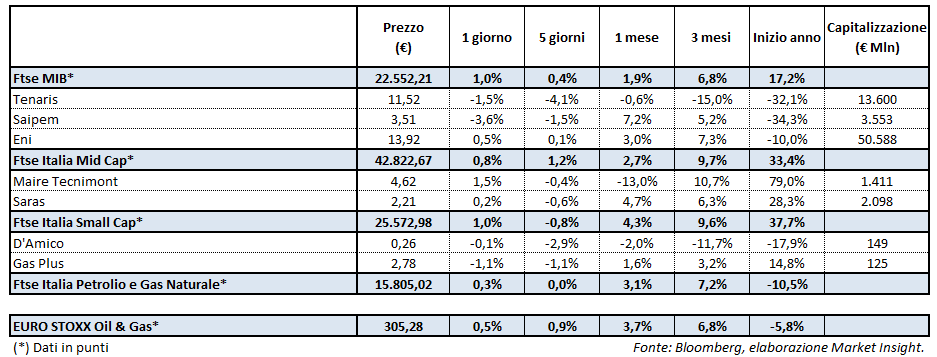 Il Ftse Mib chiude a 22.552,21 punti (+1%). Il Ftse Italia Petrolio e Gas Naturale archivia la seduta a 15.805,02 punti e l’Euro Stoxx oil&gas è a 305,28 punti (+0,5%). Per quanto riguarda i titoli del comparto chiudono in rosso la seduta Tenaris e Saipem, rispettivamente -1,5% e -3,6 per cento. Quest’ultima soffre il taglio di raccomandazione di GS da buy a neutral con target price a 3,9 euro, dal precedente 4,9 euro. In lieve crescita Eni a 13,9 euro (+0,5%).