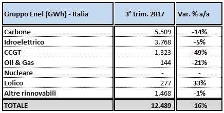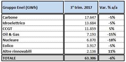 Entrando nel dettaglio, nel 3° trimestre 2017 la produzione netta di energia elettrica del gruppo Enel è stata pari a 63.306 GWh, in calo del 6% rispetto allo stesso periodo del 2016. In particolare, il gruppo guidato da Francesco Starace ha registrato per il terzo trimestre consecutivo il crollo dell’output delle centrali nucleari (-18% a/a), accompagnato da una nuova flessione della generazione idroelettrica (-5% a/a), ma anche dalla contrazione della produzione eolica (-5% a/a) e di quella a carbone (-5% a/a). In aumento, invece, la generazione di energia elettrica relativa agli impianti CCGT (+5% a/a) e da quelli alimentati da altre fonti rinnovabili (+11% a/a).