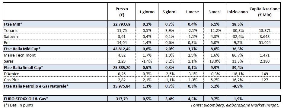 Il Ftse Mib chiude al rialzo a 22.793,69 punti (+0,2%). Il Ftse Italia Petrolio e Gas Naturale archivia la seduta a 15.975,84 punti (+1,3%) e l’Euro Stoxx oil&gas è a 317,79 punti (+0,5%).