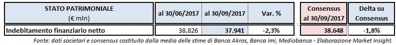Sul fronte dello Stato patrimoniale, l’indebitamento finanziario netto al 30 settembre 2017 è stato pari a 37,94 miliardi, in flessione del 2,3% rispetto allo scorso 30 giugno a causa del fabbisogno generato dall’acquisizione di EnerNOC e dagli investimenti, dal pagamento del saldo sul dividendo relativo all’esercizio 2016 (per un totale di 0,09 euro per azione, per un importo di circa 915 milioni), i cui effetti sono parzialmente compensati dai flussi di cassa operativi e dall’andamento dei tassi di cambio che ha inciso sulla parte dell’indebitamento espressa in valute diverse dall’euro.