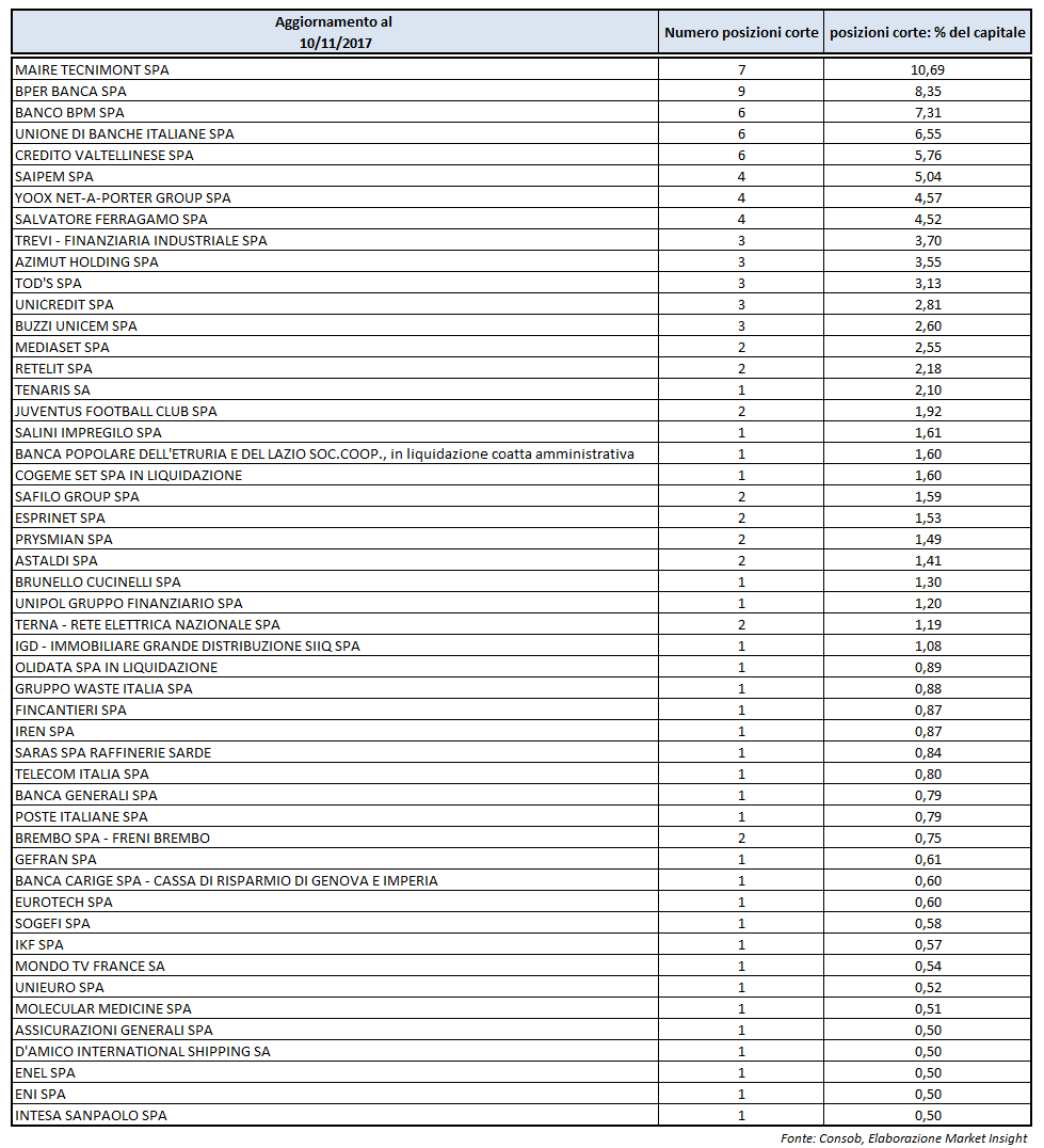 In data odierna il titolo più shortato è ancora Maire Tecnimont con 7 posizioni nette corte per una quota pari al 10,69% del capitale (7 posizioni pari al 10,39% del capitale al 3 novembre).