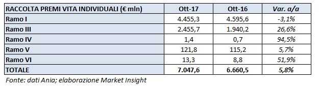 La raccolta premi delle polizze vita individuali, a ottobre, si è fissata a 7 miliardi (+5,8% rispetto allo stesso mese del 2016). Un andamento che riflette una flessione della raccolta premi delle polizze vita tradizionali di Ramo I (-3,1% a 4,5 miliardi), con un peso di circa il 63% sul totale, e una significativo crescita di quella delle polizze vita di ramo III (+26,6% a 2,5 miliardi), che rappresenta circa il 35% del totale.