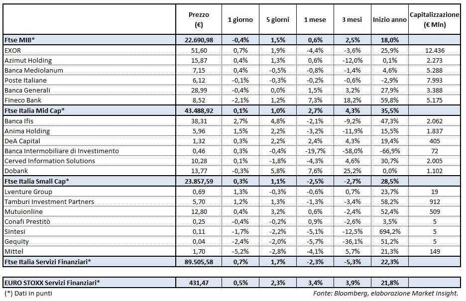 ll Ftse Italia Servizi Finanziari avvia la settimana consolidando il progresso di quella precedente (+0,7%) e in linea all’omologo europeo (+0,5%), non risentendo della flessione del comparto bancario (-1%) e terminando in modo opposto al Ftse Mib (-0,4%).
