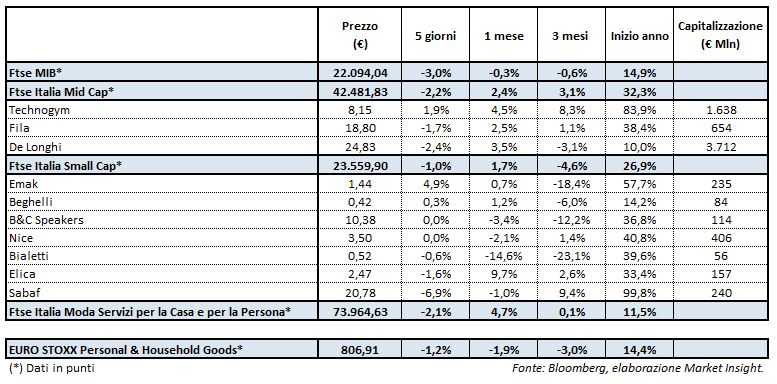 In calo anche il Ftse Italia Moda Servizi per la Casa e per la Persona, che ha segnato un -2,1% w/w rispetto al -1,4% w/w del corrispettivo indice europeo. Nel settore dei beni per la casa, vendite su De’Longhi (-2% w/w) e Fila (-1,4% w/w), mentre ha chiuso l’ottava in controtendenza Technogym (+1% w/w).