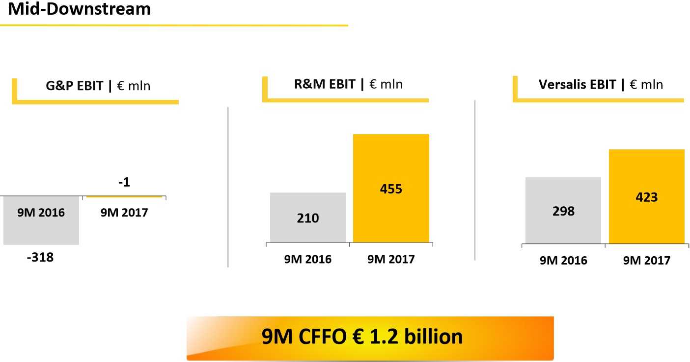 Superiori alle attese anche i risultati conseguiti nel mid-downstream, ove, puntualizza Massimo Mondazzi, “sono stati evidenti i risultati della nostra strategia di trasformazione e la solidità del nostro turn around. In questo ambito abbiamo infatti registrato un Ebit di circa 900 milioni di euro, grazie al positivo contributo di tutte e tre le aree di business in cui si articola la nostra attività nel comparto: Gas & Power, Refining & Marketing e chimica”.