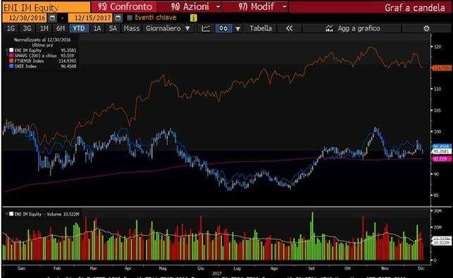 Il titolo Eni ha archiviato le ultime cinque sedute sostanzialmente invariato, chiudendo venerdì a 13,91 in linea all’Eurostoxx di settore, meglio del Ftse Mib, che ha sofferto prevalentemente della debolezza del settore bancario.