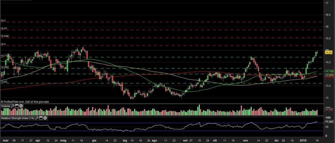 -1,0% è la potenziale flessione rispetto al primo supporto a 14,70 euro;