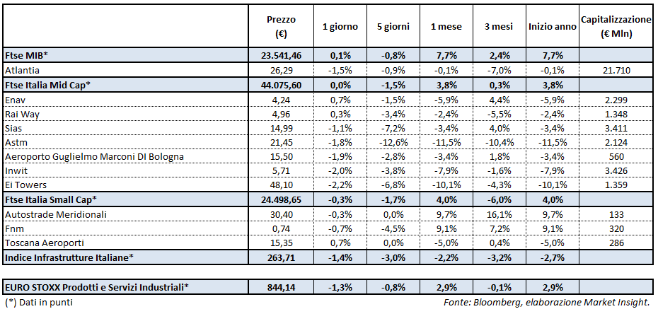 L’indice infrastrutture italiane ha terminato la seduta di ieri in flessione dell’1,4%, in linea l’Euro Stoxx Prodotti e Servizi Industriali (-1,3%) e sottoperformando il Ftse Mib (+0,1%).