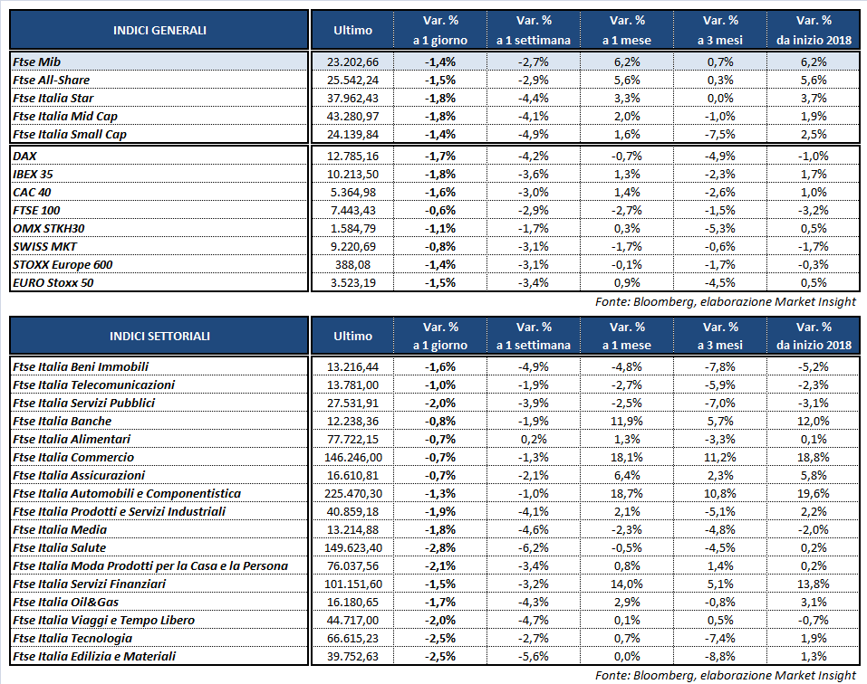 Chiusura in territorio negativo per i listini europei, che continuano ad essere messi a dura prova dal rialzo dei rendimenti obbligazionari. Il Ftse Mib termina in flessione dell’1,4% a 23.202,66 punti. Il Ftse 100 di Londra è quello meno penalizzato (-0,6%), mentre il Dax di Francoforte, il Cac 40 di Parigi e l’Ibex 35 di Madrid cedono oltre 1,5 punti percentuali.