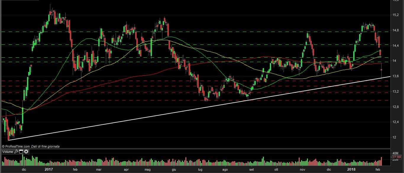In attesa dei risultati del quarto trimestre del 2017 che saranno annunciati il prossimo 16 febbraio, le quotazioni dei titoli colosso petrolifero italiano hanno arrestato a quota 15 euro il movimento rialzista in atto da fine agosto. Il mancato superamento di questo livello (tentato per due volte nella seconda metà di gennaio) è stato accompagnato dall’interruzione del rally del prezzo del petrolio e ha poi favorito a partire dallo scorso 29 gennaio l’avvio di un movimento discendente che ha registrato una decisa accelerazione negli ultimi giorni (con ben due gap down), in concomitanza con la forte debolezza delle Borse mondiali.