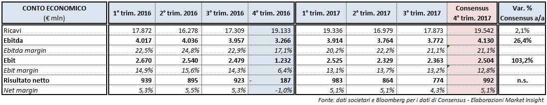 Sulla base dei dati di consensus raccolti da Bloomberg, nel 4° trimestre del 2017 i ricavi di Enel sono attesi in crescita del 2,1% rispetto allo stesso periodo del 2016 a quota 19,5 miliardi, mentre per l’Ebitda è stimato un balzo del 26,4% su base annua, con una previsione di 4,13 miliardi.