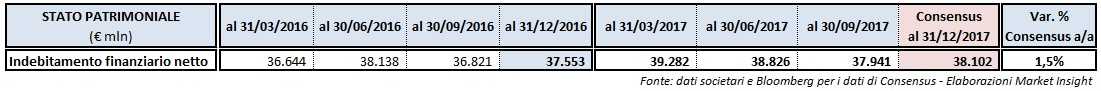 Le stime raccolte indicano poi un indebitamento finanziario netto al 31 dicembre 2017 pari a 38,1 miliardi, in aumento dell’1,5% rispetto a fine 2016.