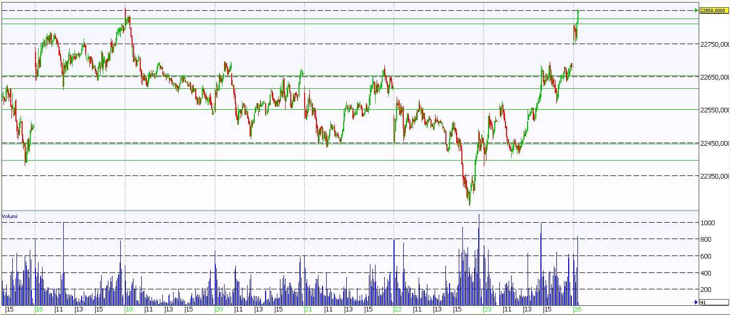 Sarà molto importante per il mercato italiano riuscire a chiudere la seduta al di sopra di questa resistenza. Se così fosse, è molto facile che nelle prossime sedute si vada a raggiungere anche quota 23.000/23.100 punti. Attenzione tuttavia a sposare la tesi rialzista in anticipo, perché è possibile che il mercato lungo questa seduta inverta la rotta per andare a chiudere il gap di apertura con primo obiettivo ribassista a 22.680 punti e 22.600 in seconda battuta.