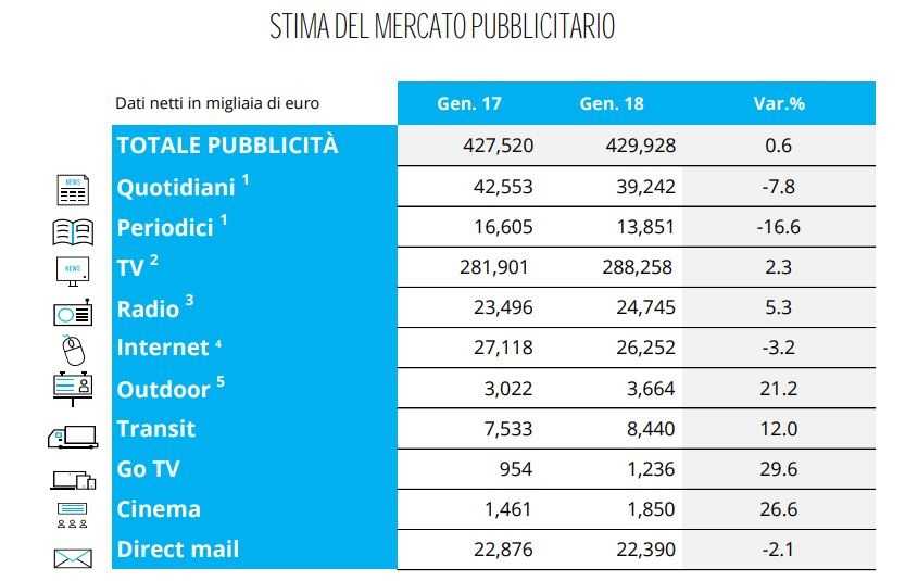 Dalla lettura dei dati Nielsen relativi agli investimenti pubblicitari in Italia, nel primo mese del 2018 emerge una crescita del 2,6% per 14,3 milioni rispetto al pari periodo 2017, mentre al netto dei search e social l’incremento si riduce allo 0,6 per cento.