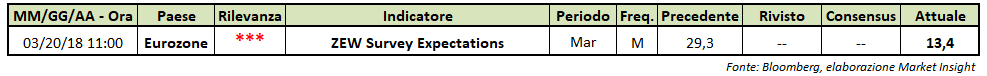 A marzo l’indice Zew relativo alle aspettative di crescita economica dell’Eurozona è calato a 13,4 punti dai 29,3 registrati a febbraio.