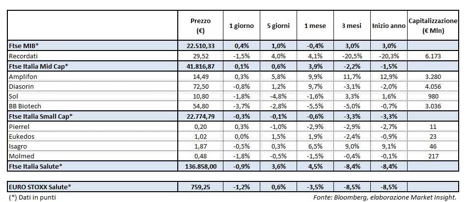 Ieri il Ftse Italia Salute ha registrato un -0,9% facendo meglio del corrispondente europeo (-1,2%) ma sottoperformando il Ftse Mib (+0,4%).