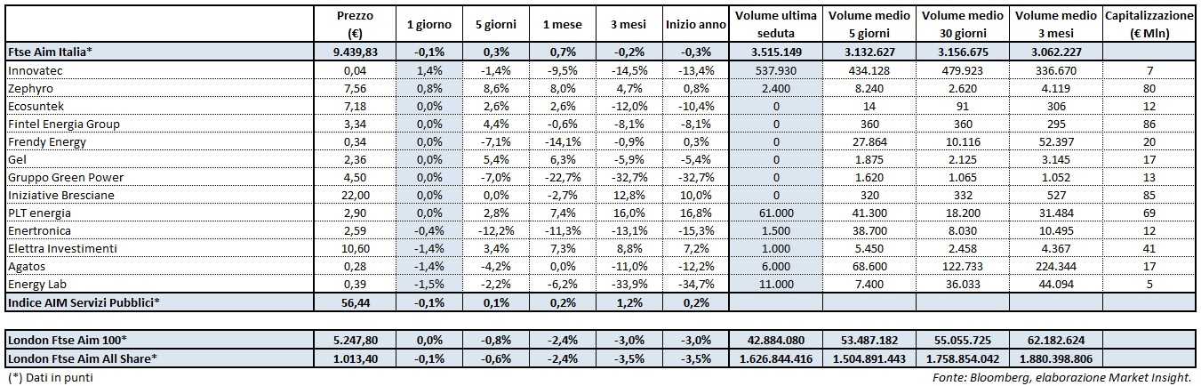 Chiude leggermente sotto la parità anche l’indice Aim Servizi Pubblici che ha perso lo 0,1%.