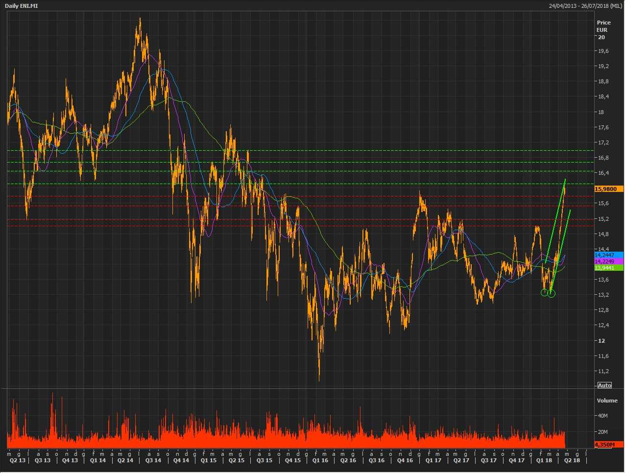 La performance da inizio 2018 dei titoli Eni è pari a +15,8%, mentre il target price medio sulla base dei contributi dei 28 analisti rilevati da Bloomberg è pari a 16,43 euro, con un potenziale rialzista del 2,8 per cento.