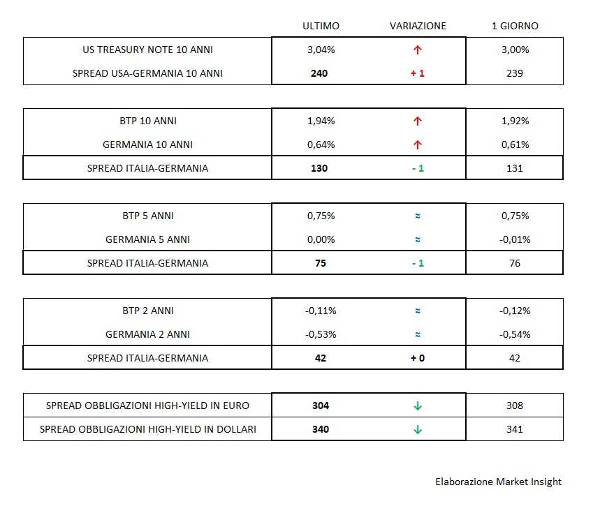 Il movimento dei rendimenti interessa tutti i governativi e specie il tratto più lungo della curva, con il Bund che tocca 0,64% e il Btp 130 basis point in più (1,94%), il livello più alto da fine marzo.
